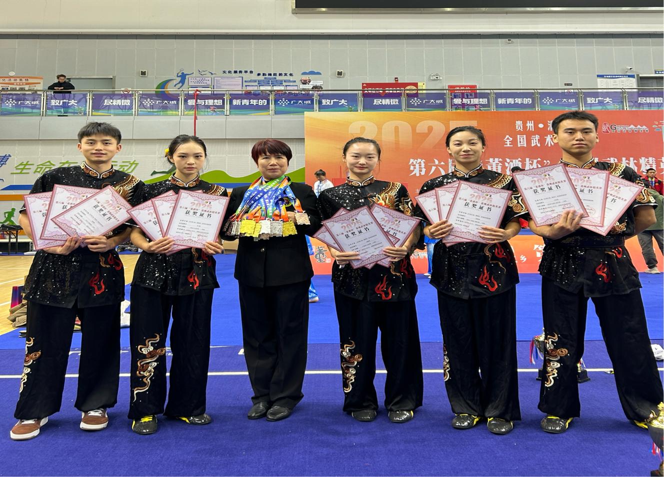 11月2日,第六届“董酒杯”贵州武林精英赛在贵州清镇圆满收官。BV伟德中国官方网站健康管理学院5名学子组成参赛队伍,在陈晓梅老师的专业指导,以及公共教学部包健老师、蒙品闯老师的带领下,凭借扎实的武学功底与顽强的竞技精神,在赛事中斩获亮眼成绩。