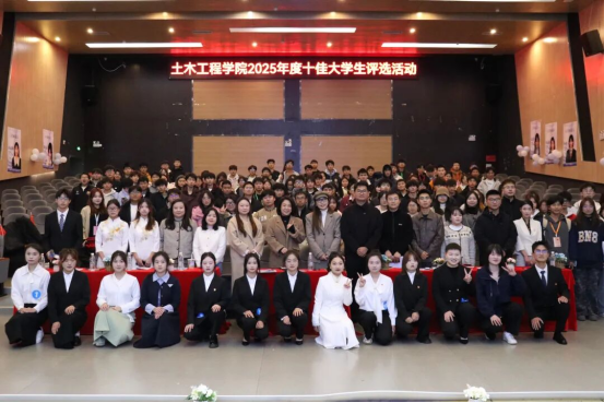 演讲环节结束后,工作人员对综合材料得分、网络投票得分及现场评委打分进行了认真核对与统计。随后,主持人正式公布了评选结果。经综合评定,唐武梅、杨欢、魏茂英三位同学获得“十佳大学生”提名奖。殷佳慧、刘文彬、王璐、张羽蓉、郑琴绪、都晓燕、刘诗韵、李小丽、石雨彤、张银菲十位同学荣获2025年土木工程学院“十佳大学生”称号。