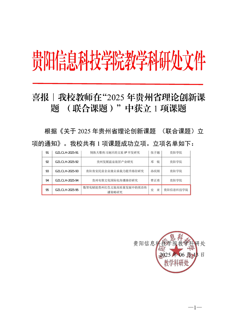喜报∣伟德官网教师在“2025年贵州省理论创新课题 (联合课题)”中获立1项课题