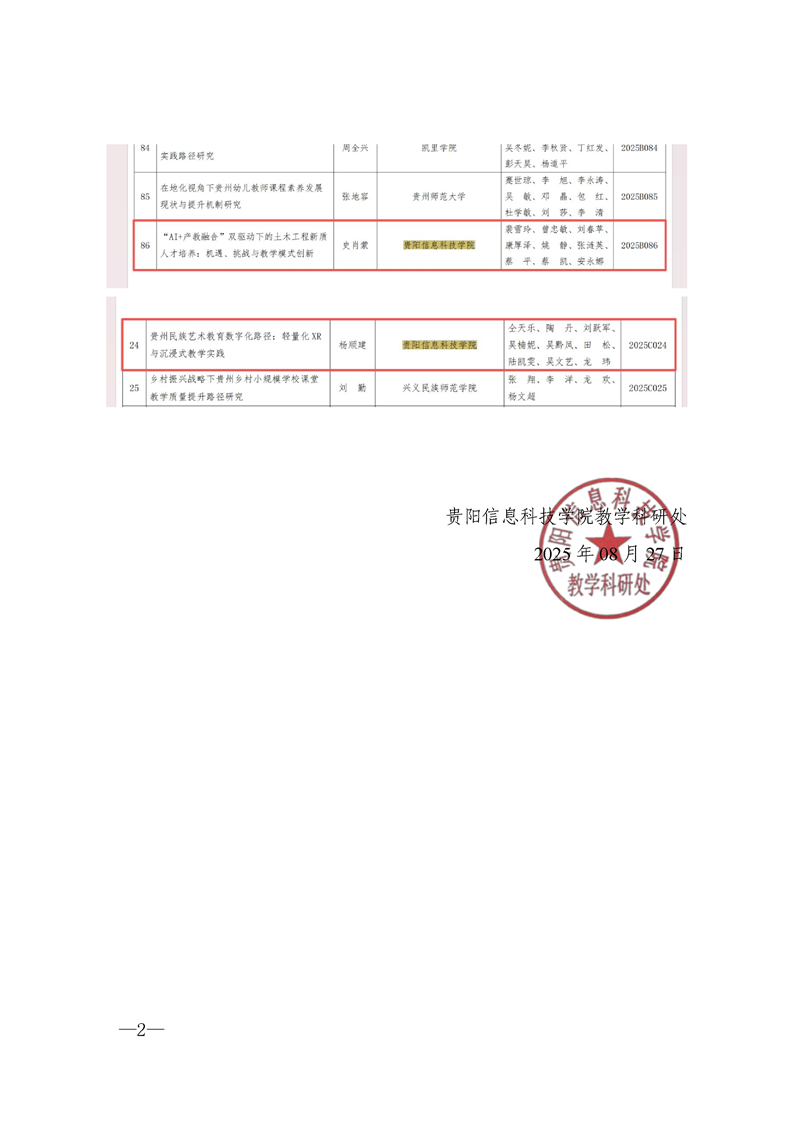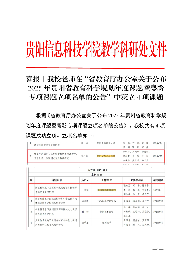 喜报∣伟德官网老师在“省教育厅办公室关于公布2025年贵州省教育科学规划年度课题暨粤黔专项课题立项名单的公告”中获立4项课题