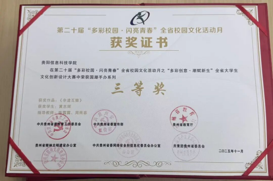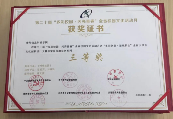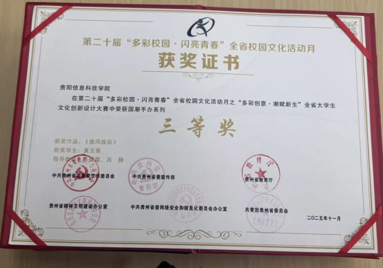 其中,伟德官网师生在“多彩创意·潮赋新生”全省大学生文化创新设计大赛中荣获三项三等奖,在“黔心向党·红剧薪传”贵州省高校红色剧本杀创作大赛荣获三等奖。