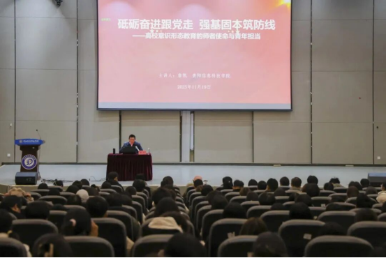 为深入学习贯彻习近平总书记关于意识形态工作的重要论述,切实巩固学校意识形态阵地,明确新时代高校教师的育人使命与青年学子的责任担当,11月19日中午,学校党委副书记詹凯在图书馆报告厅作题为《砥砺奋进跟党走 强基固本筑防线 高校意识形态教育的师者使命与青年担当》的专题讲座,学校党群工作部、学生工作处、团委、各学院党总支书记、支部书记、团总支书记以及第六期入党积极分子、“贵科菁英”学生骨干培训第一期第一课共计300余人共同参与。