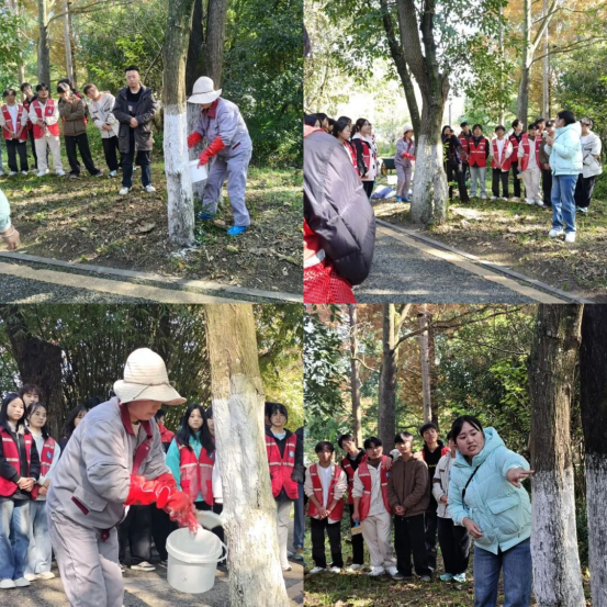 为化解实践技术难点,活动启动前一周,负责人已与花溪公园管理处完成对接,敲定流程并邀请园林师傅担任技术指导。在公园林荫道间,同学们分组协作、各司其职:有的清理树皮杂质,为刷白工作筑牢基础;有的双人配合,一人扶桶、一人涂刷,确保涂层平整无遗漏;有的主动承担体力任务,搬运石灰桶、整理工具,随时补位支援。身穿红马甲的身影穿梭林间,同学们汗流浃背却毫无怨言,在相互协作中传递团结力量与青年担当。