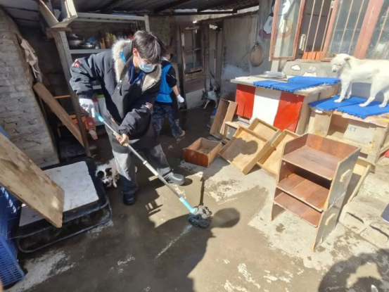 活动现场,志愿者们手持扫帚、垃圾袋清理院落的落叶和杂物,蹲身擦拭笼舍缝隙的污渍,细致疏通墙角排水口;沾泥的垫子被冲洗晾晒,狗舍内外喷遍消毒水,一个个食盆被刷得锃亮。原本杂乱的小院很快变得整洁敞亮,一只先前总躲在旧木箱里的小狗,也主动探出头蹭了蹭志愿者的裤脚,亲昵里满是信任。