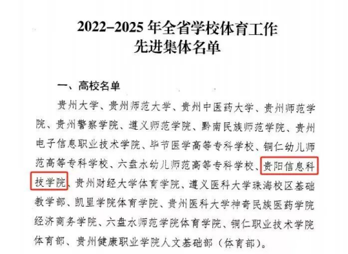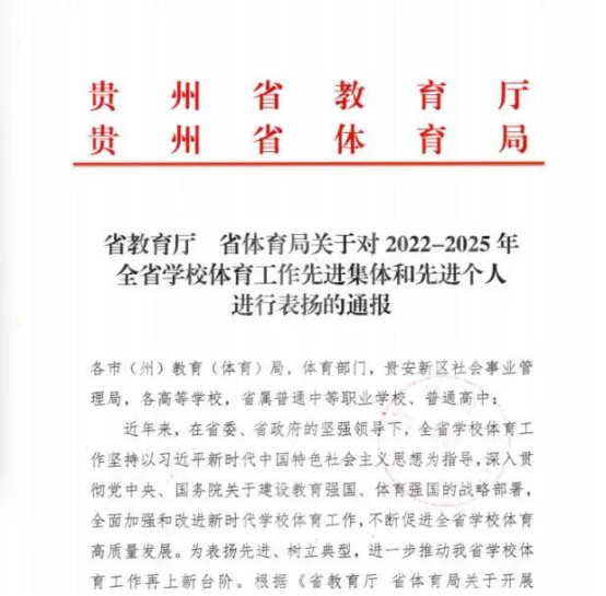 新闻网讯(供稿/供图 公共教学部)近日,贵州省教育厅、贵州省体育局联合下发《关于对2022—2025年全省学校体育工作先进集体和先进个人进行表扬的通报》(以下简称《通报》),对在全省学校体育工作中做出突出贡献的集体与个人予以通报表扬。伟德官网公共教学部体育教研室凭借扎实的教学工作、优异的竞赛成绩和突出的育人成效,荣获“2022—2025年全省学校体育工作先进集体”称号,跻身全省57个受表彰的先进集体之列。