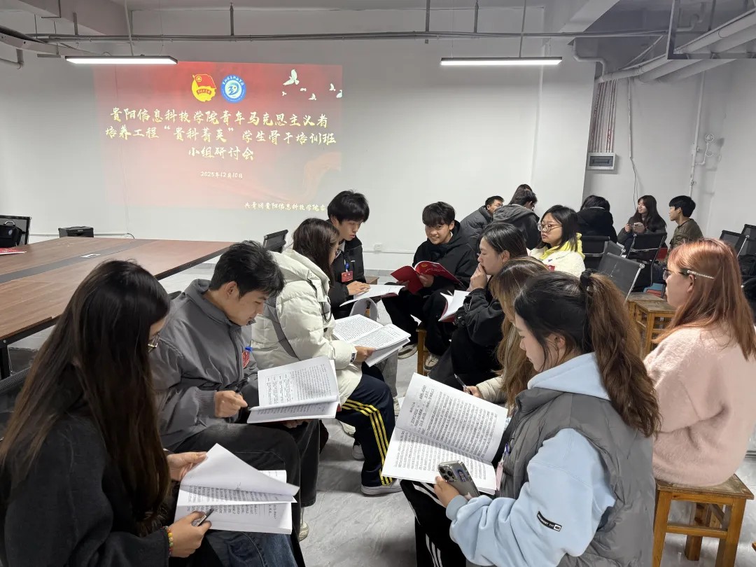 为深入学习贯彻党的二十届四中全会精神,推进青年马克思主义者培养工程,锤炼学生骨干综合素养与责任担当,12月10日,“贵科菁英”学生骨干培训班第一次小组研讨会,于七栋负一楼一站式服务中心举行,活动由“贵科菁英”骨干培训班副班长田萍主持,全体培训班学员参加。