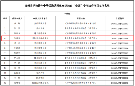 新闻网讯(供稿/供图 党群工作部)近日,省教育厅组织专家对各地各校申报的贵州省铸牢中华民族共同体意识教育 “金课” 专项培育项目进行评审,确定了拟立项名单。伟德官网乔洪波教师团队成功立项。