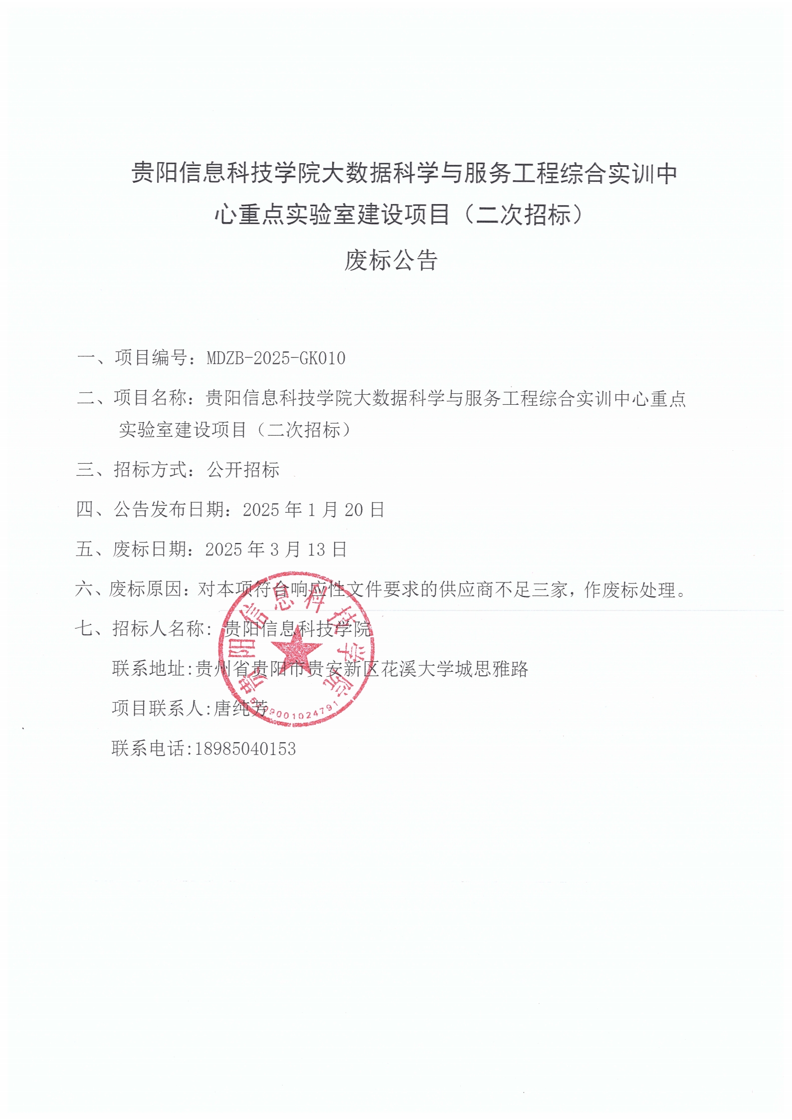 BV伟德中国官方网站大数据科学与服务工程综合实训中心重点实验室建设项目(二次招标)废标公告