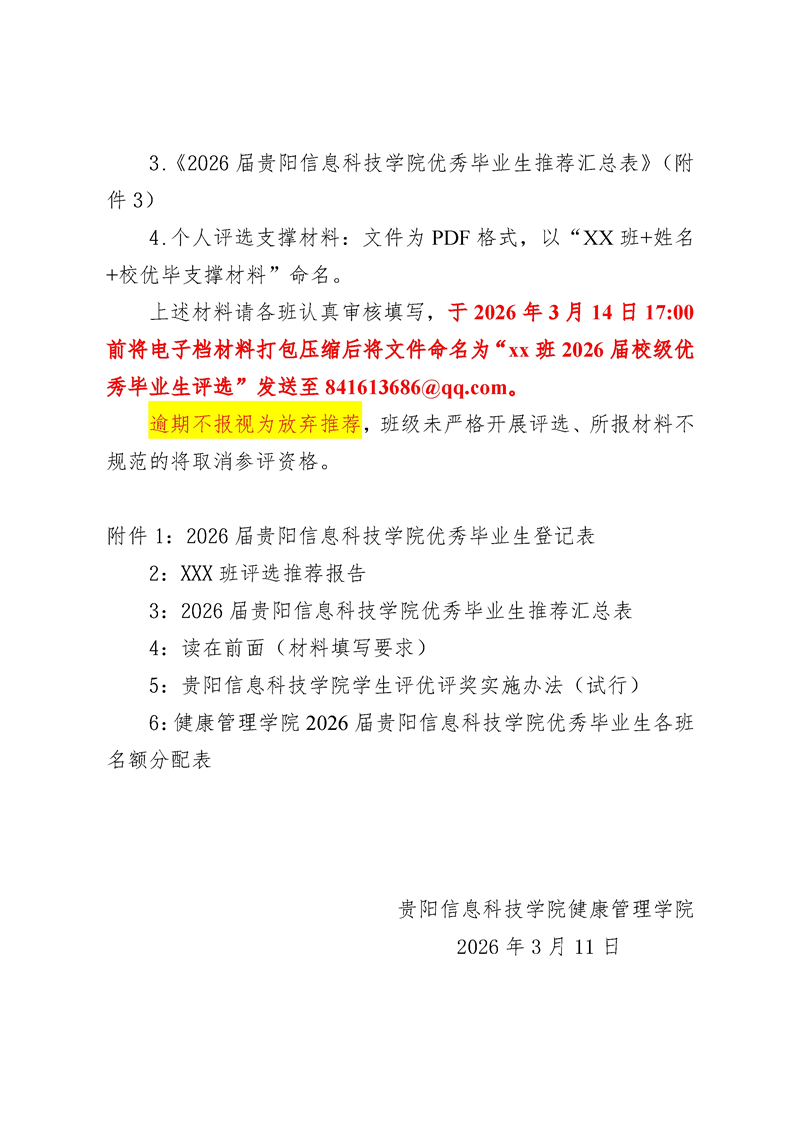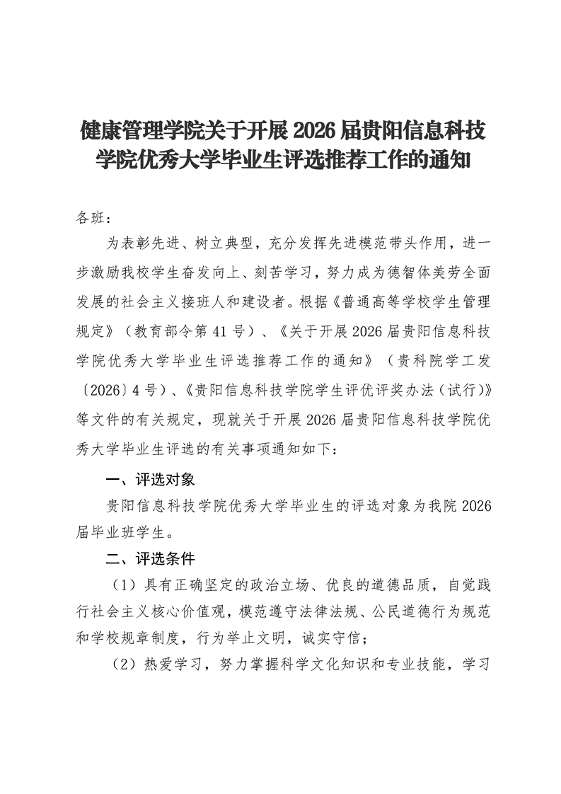 健康管理学院关于开展 2026 届贵阳信息科技 学院优秀大学毕业生评选推荐工作的通知