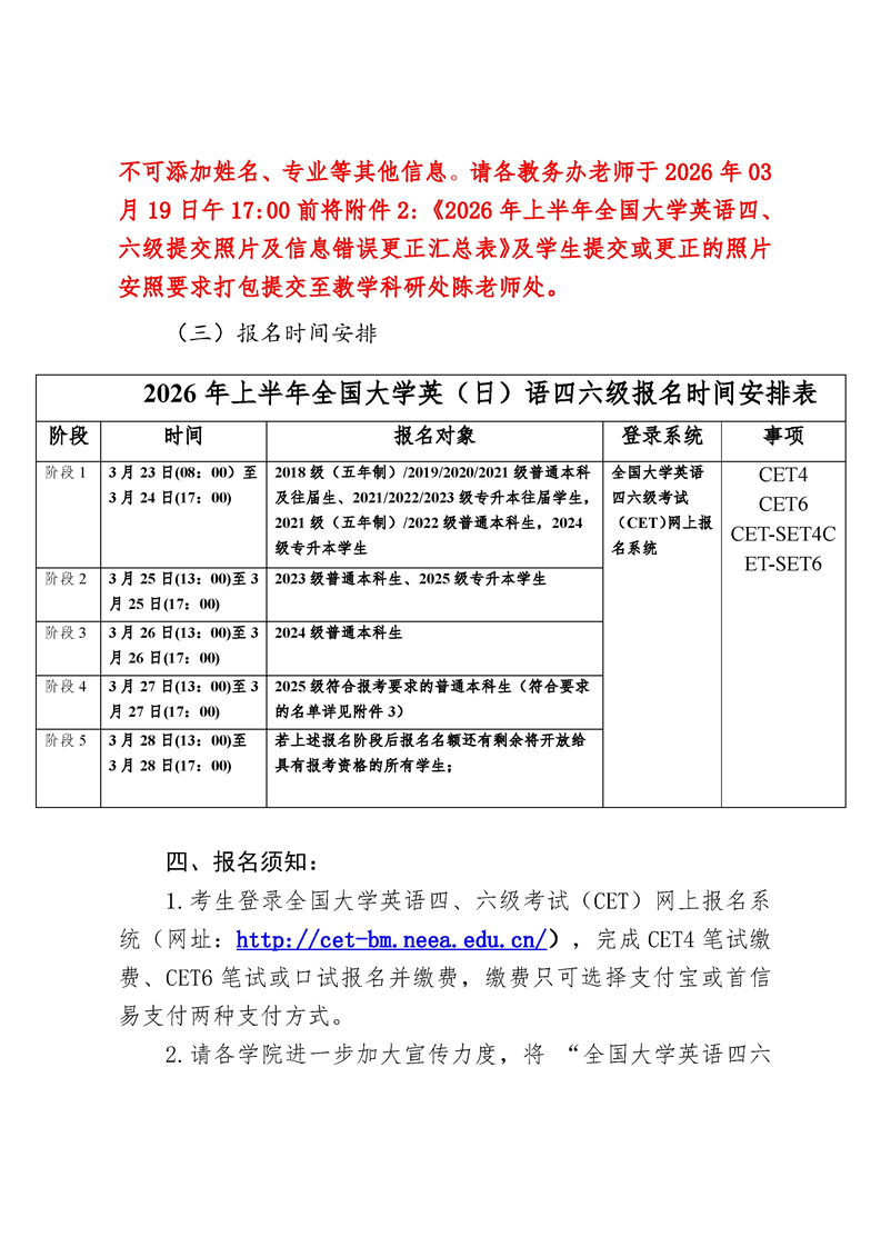 转BV伟德中国官方网站教学科研处关于做好 2026 年上半年全国大学英(日)语 四、六级考试报名工作的通知