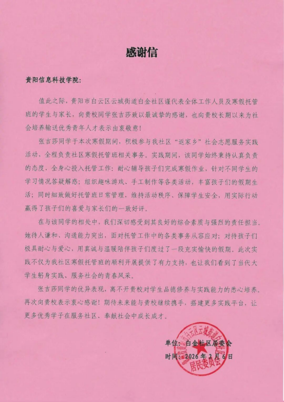 近日,贵阳市白云区云城街道白金社区居委会向伟德官网发来一封感谢信,信中对伟德官网会计2302班张吉莎在寒假期间“返家乡”社会实践活动中的优秀表现做出了高度赞扬,并向伟德官网表达了真诚的感谢。