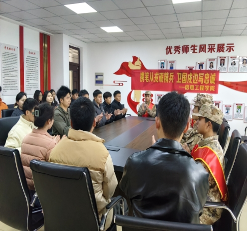 信息工程学院的专题座谈会上,信息工程学院退役士兵学生代表与新兵们围坐交流,以退役老兵的身份分享军旅感悟。他们用自己在部队的成长故事,鼓励新兵们珍惜机遇、勇挑重担,在艰苦训练中磨砺意志,在集体生活中学会担当,把青春热血挥洒在祖国最需要的地方,用实际行动践行“携笔从戎、卫国戍边”的誓言。
