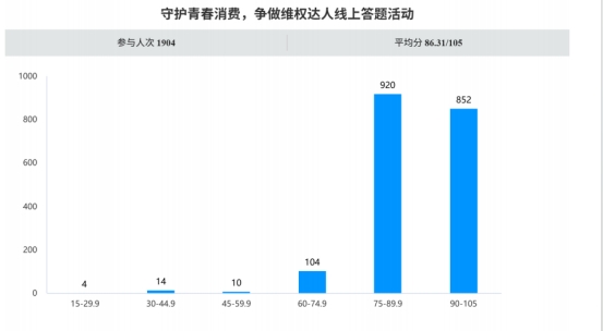 活动自3月18日启动报名,3月19日至21日正式开展,全程采用线上形式,打破时间与空间限制,方便同学们灵活参与。活动共吸引2000名学生报名,实际参与答题1904人次,整体参与率达95%以上。从答题数据来看,活动平均分为86.31/105分,其中75分及以上人次达1772人,占总参与人次的93%;90分及以上高分人次达852人,占比44.7%,充分体现了同学们扎实的消费维权知识储备与良好的学习成效。