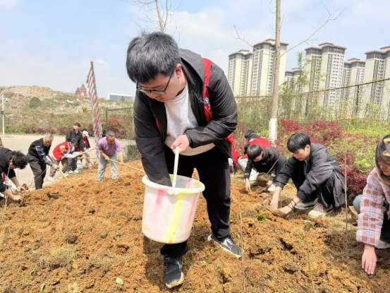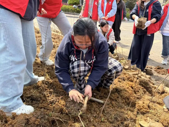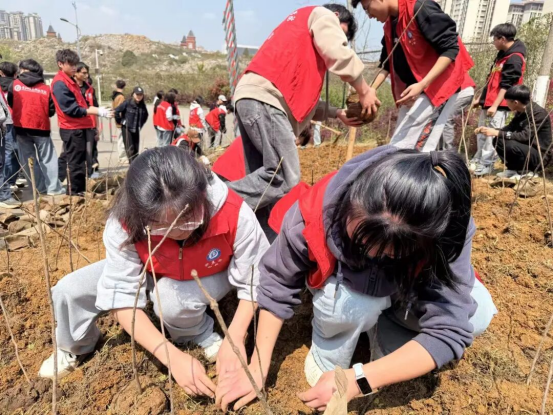 学生志愿者们精神饱满,主动扛起铁锹、拎起水桶,积极投入到植树劳作中,大家齐心协力,有的认真挖掘树坑,有的小心扶正树苗,有的仔细填土压实,还有的细心浇灌清水,每一个环节都一丝不苟,现场处处洋溢着团结协作、劳动奉献的火热氛围。