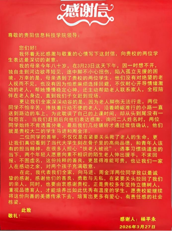 面对“扶不扶”的社会之问,他们没有迟疑,而是用行动作出了最坚定的回答——在他人最需要帮助的时刻,挺身而出。他们不仅“敢扶”,更“善扶”,在守护生命安全的同时,也守住了人心的温度。事后,老人家属杨先生专程来到学校,送来锦旗和感谢信。他在信中写道,两位同学不仅帮助老人脱离困境,更挽回了一个家庭的完整,也让人真切感受到当代大学生的责任与品德。