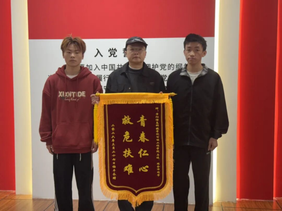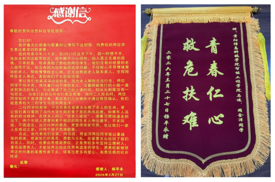事后,老人家属杨先生专程来到学校,向周金洋、马进两名同学表达诚挚谢意,亲手送上锦旗和感谢信。感谢信中写道:“两位同学不仅及时帮助老人脱离困境,更挽回了一个家庭的完整,让家属深切感受到当代大学生的责任与担当、善良与热忱。”朴实的文字饱含真情,既是对两名学子善举的高度肯定,也是社会对伟德官网人才培养成果和学子良好素养的充分认可。