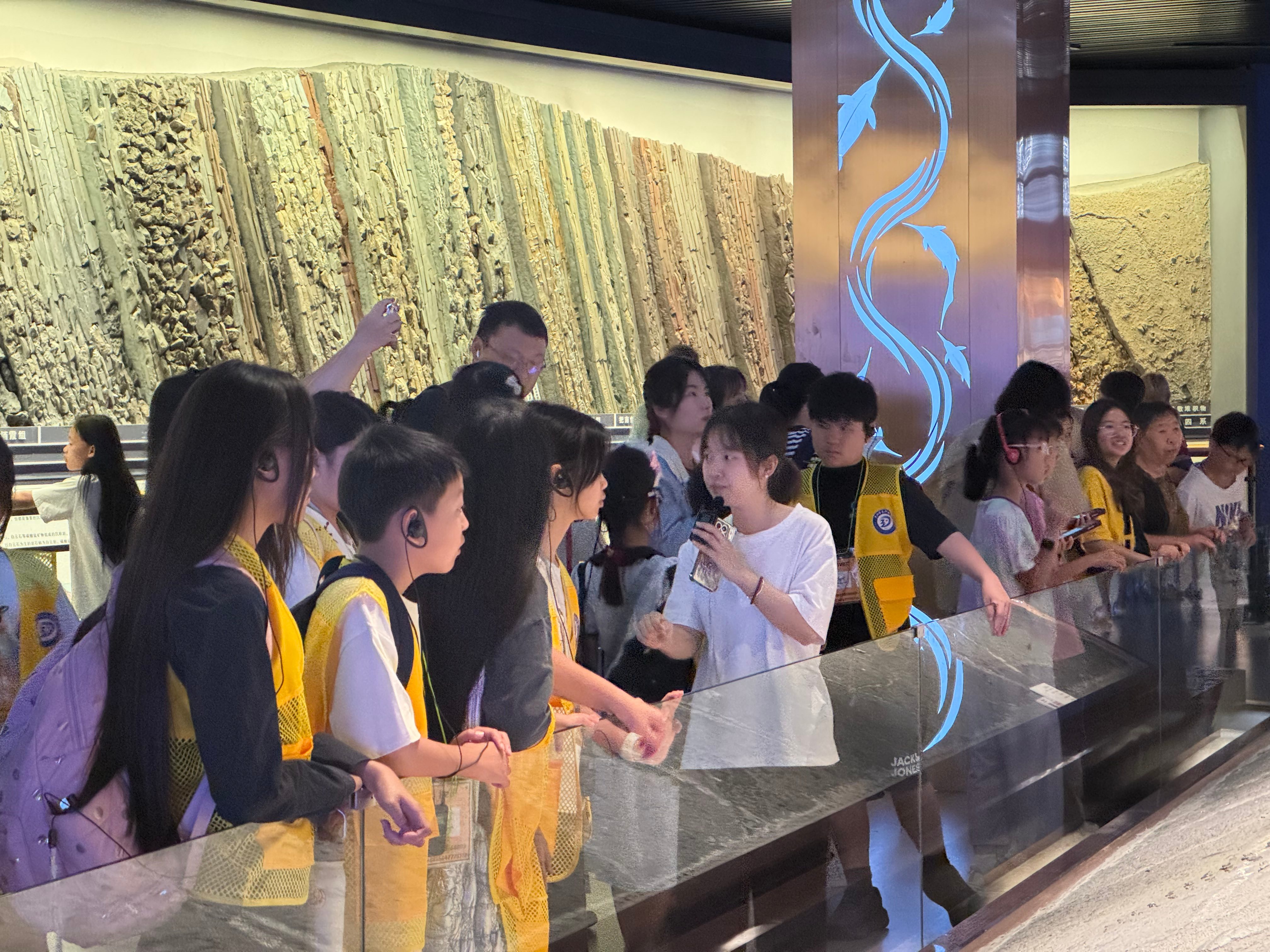 科技探索环节中,研学团走进贵州省地质博物馆,解码地球演化奥秘;登顶“中国天眼”瞭望台,在国际天文体验馆感受宇宙浩瀚,向“天眼之父”南仁东致敬;参观世界第一高混凝土塔桥—— 平塘特大桥,领略中国基建的硬核实力。