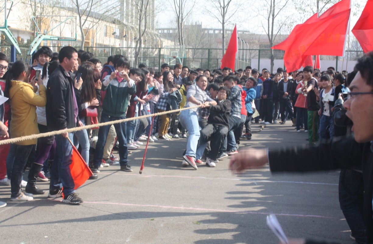 红旗飘扬,我校的各个院系代表队参赛人员于今天下午两点半左右准时到达比赛场地,三点拔河比赛正式开始。