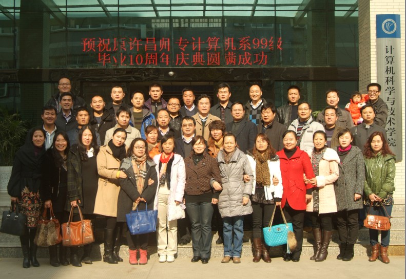 原计算机系副主任、现计算机科学与技术学院副院长胡子义,99级1班班班主任邱颍豫,99级2班班主任、现国际教育学院党总支书记杜根远在讲话中深情回顾了10年前同学们在校求学时的那一幕幕难忘情景,回顾了与同学们相处及交往的点点滴滴,情到深处不禁潸然泪下。