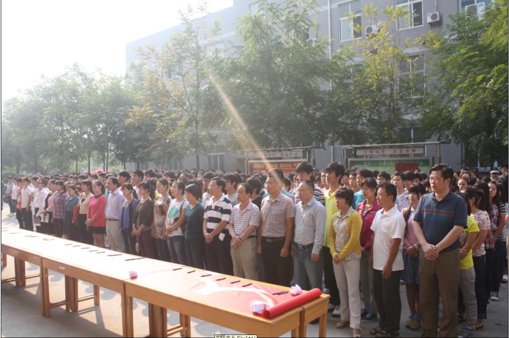 伴随着雄壮的国歌声,全体师生在肃穆的氛围中向在抗日战争中死难的同胞默哀。