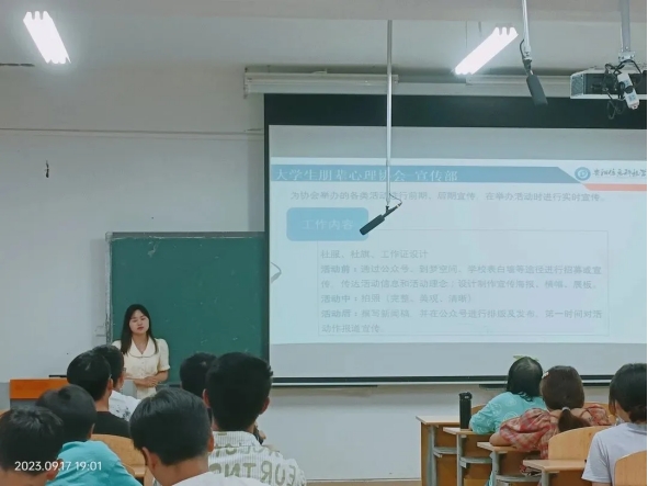 最后,牟芳艳老师从工作内容和部员要求两反面介绍了大学生朋辈心理协会宣传部、外联部、活动部,并介绍了伟德官网的大学生心理健康教育与咨询中心的成立时间、机构性质、九个功能室、咨询方式以及咨询地点,以及协会成员在接待室值班期间的主要工作事项。