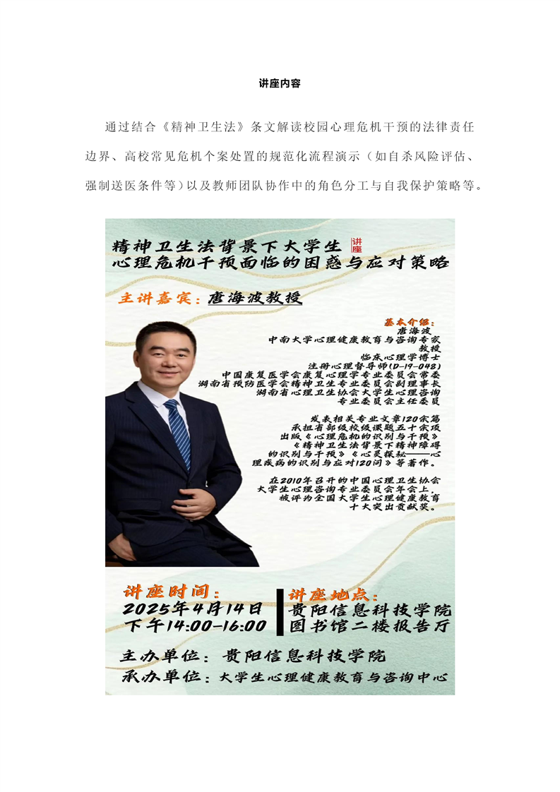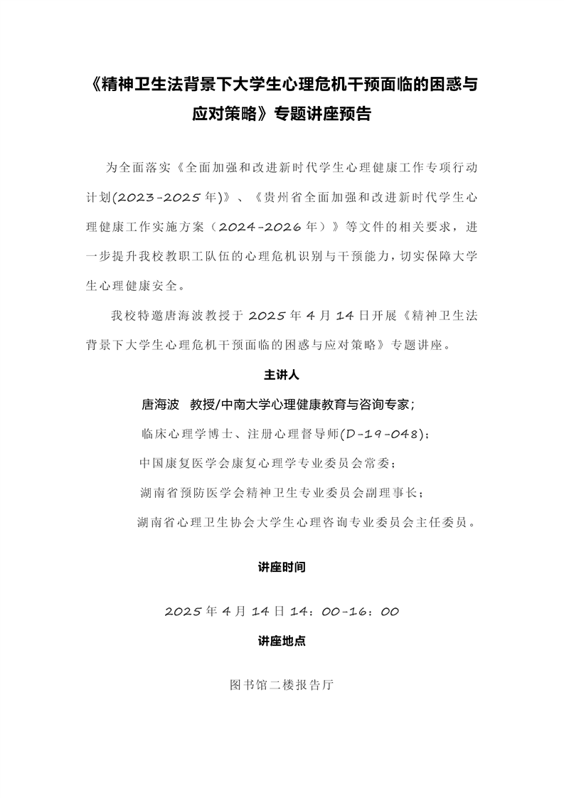 《精神卫生法背景下大学生心理危机干预面临的困惑与应对策略》专题讲座预告