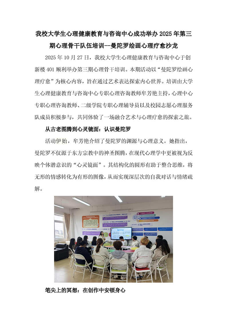 伟德官网大学生心理健康教育与咨询中心成功举办2025年第三期心理骨干队伍培训--曼陀罗绘画心理疗愈沙龙