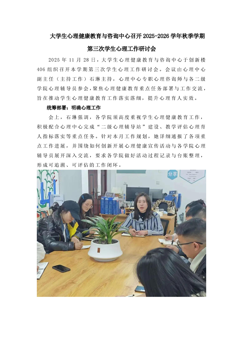 大学生心理健康教育与咨询中心召开2025-2026学年秋季学期第三次学生心理工作研讨会