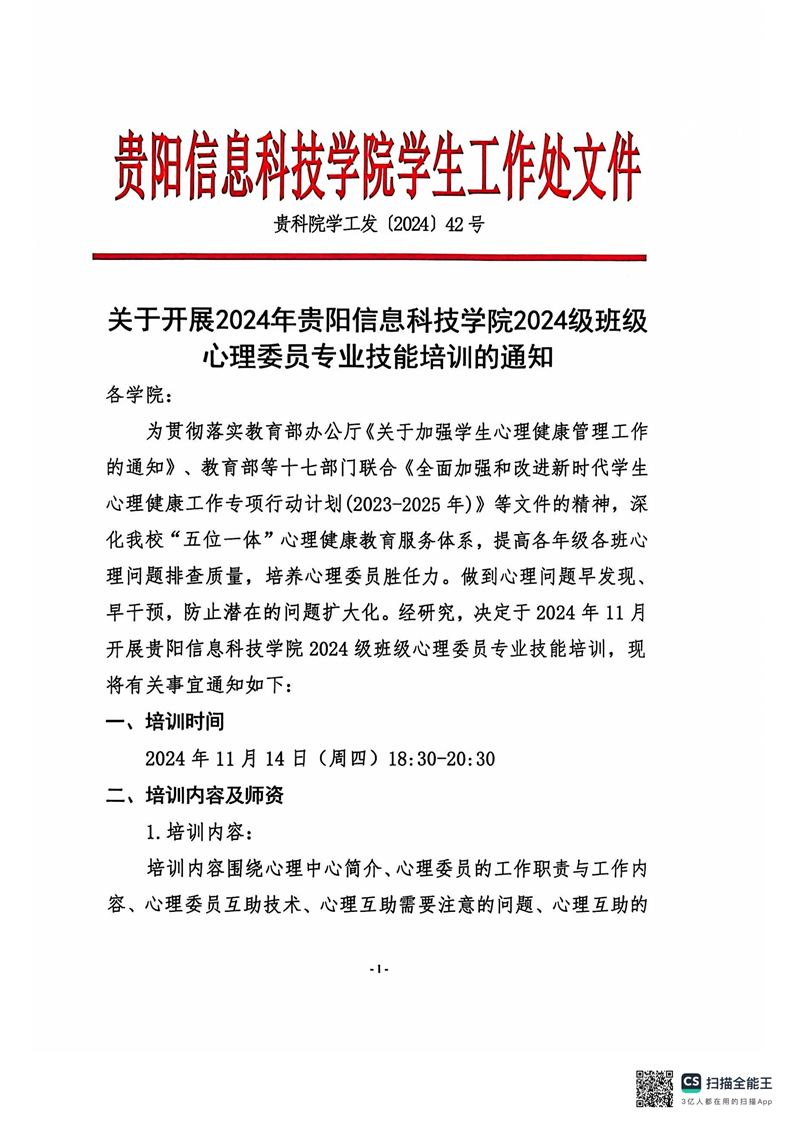 关于2024年班级心理委员技能培训的通知