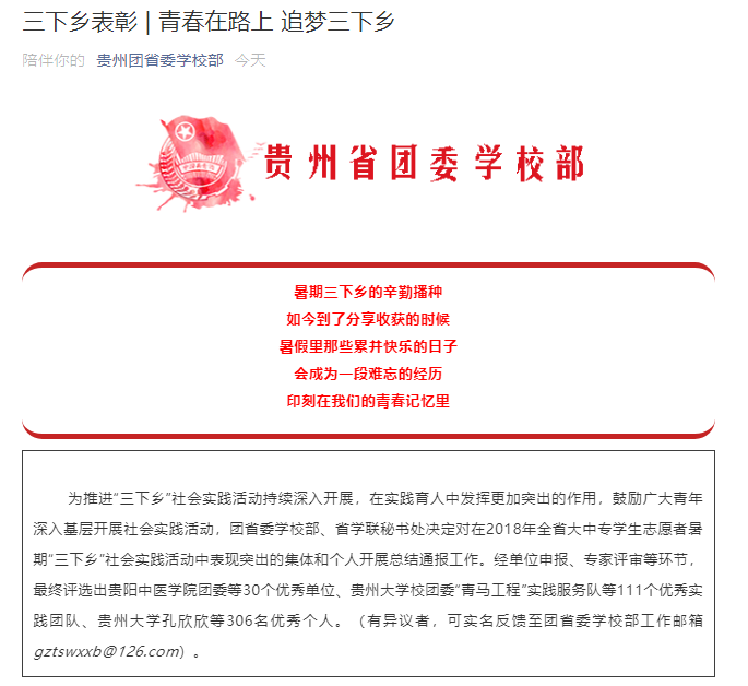 12月25日,贵州省团省委学校部微信公众号发布了
