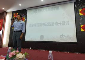 活动伊始,由金明辉副书记为本次活动致开幕词,为活动拉开了序幕,金书记强调:评选十佳毕业生是深入贯彻落实党的教育指导方针,同时也是对大学四年来优秀同学的一个肯定,各位同学需向他们看齐学习,望各位评委老师能评选出优秀的十佳毕业生。金书记的致词引起了同学们的沉思,全场响起了热烈的掌声。随后退伍大学生赵飞剑学长为我们带来励志分享,指明了明德男儿投身军旅的前进方向。