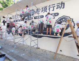 墙绘妙笔生花,剪纸美丽乡村。来到圆梦社区,只见文化墙下穿梭着同学们忙碌的身影,显得格外热闹。他们发挥着自己的专业特长,以梦为马、以笔为引,把心中之意化为笔下之文,在洁白的墙壁上,用极其巧妙的设计构思理念在墙壁上呈现出“扫黄打非”五大专项行动内容。墙体承载着文化,绘画展现着风景,文化建设是乡村振兴的灵魂,在绘制墙画的这几天,同学们每天清晨时分便开始作画,即使顶着炙热的太阳,三十多度的高温,从早到晚,他们从未将手中的画笔停过,也没有丝毫的抱怨,因为他们希望能够发挥自己的特长,用手中的画笔为圆梦社区的墙面多添一份色彩,为乡村振兴贡献一份力量。