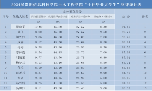 经过激烈的角逐,由师生组成的评审团现场打分,综合网络投票、个人材料等得分,最终工管2001班崔琼雯、建工2001班熊飞、岩土2001班阙兴伟、造价2002班成蓉、工管2002班冉婷、工管2001班陈林霞、工管2002班刘晟玉、造价2002班杨梦兰、建工2001班代浪、地信2001班田茂兵,在众多候选人中脱颖而出,荣获2024年BV伟德中国官方网站土木工程学院“十佳毕业生”荣誉。城规1901班吴敏璐同学荣获2024年BV伟德中国官方网站土木工程学院“自强之星”荣誉。