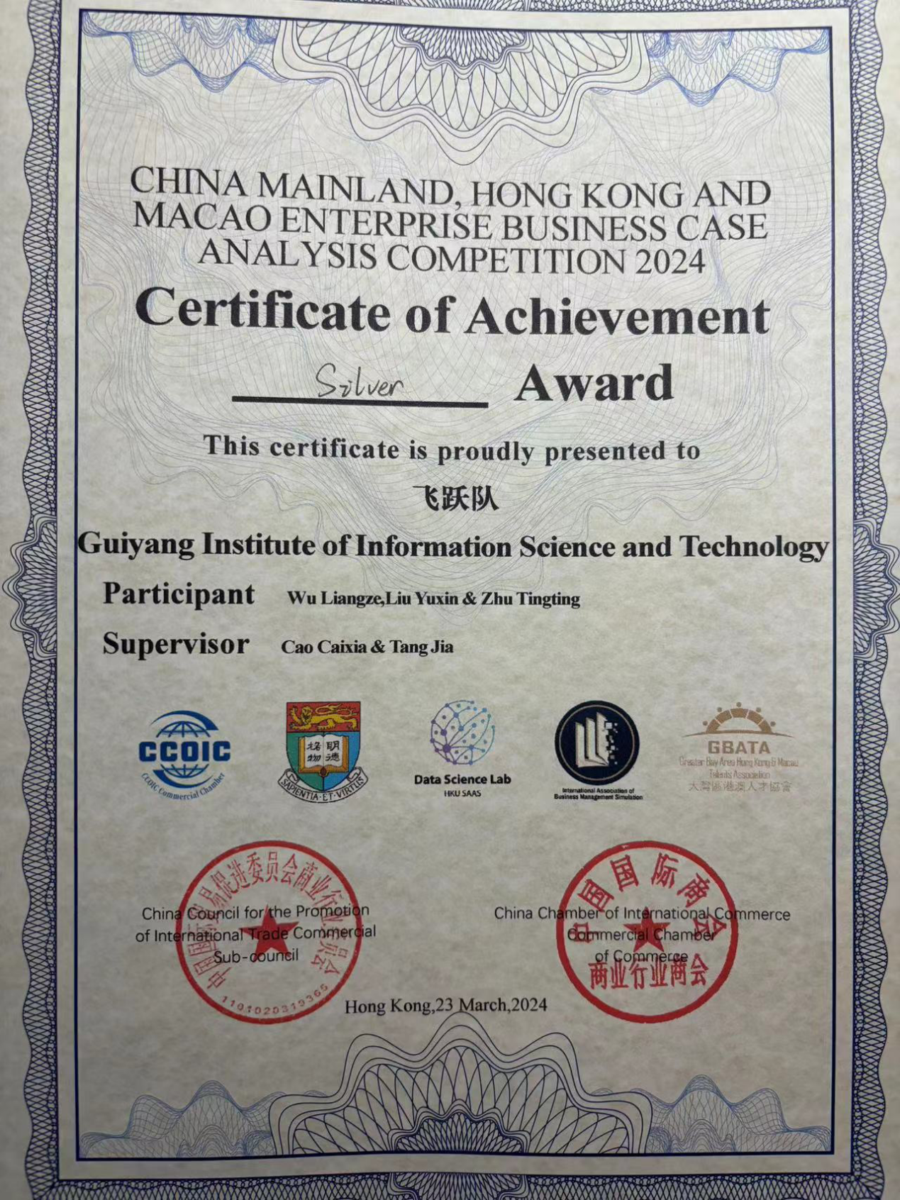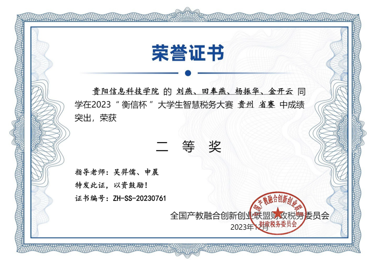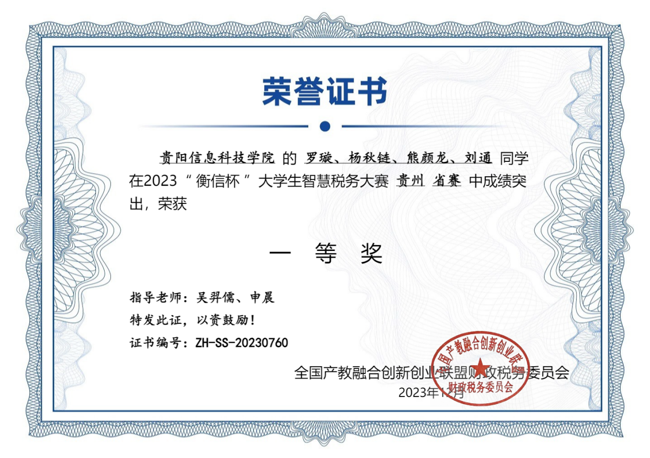 2.“衡信杯”大学生智慧税务大赛贵州省省赛一等奖、二等奖