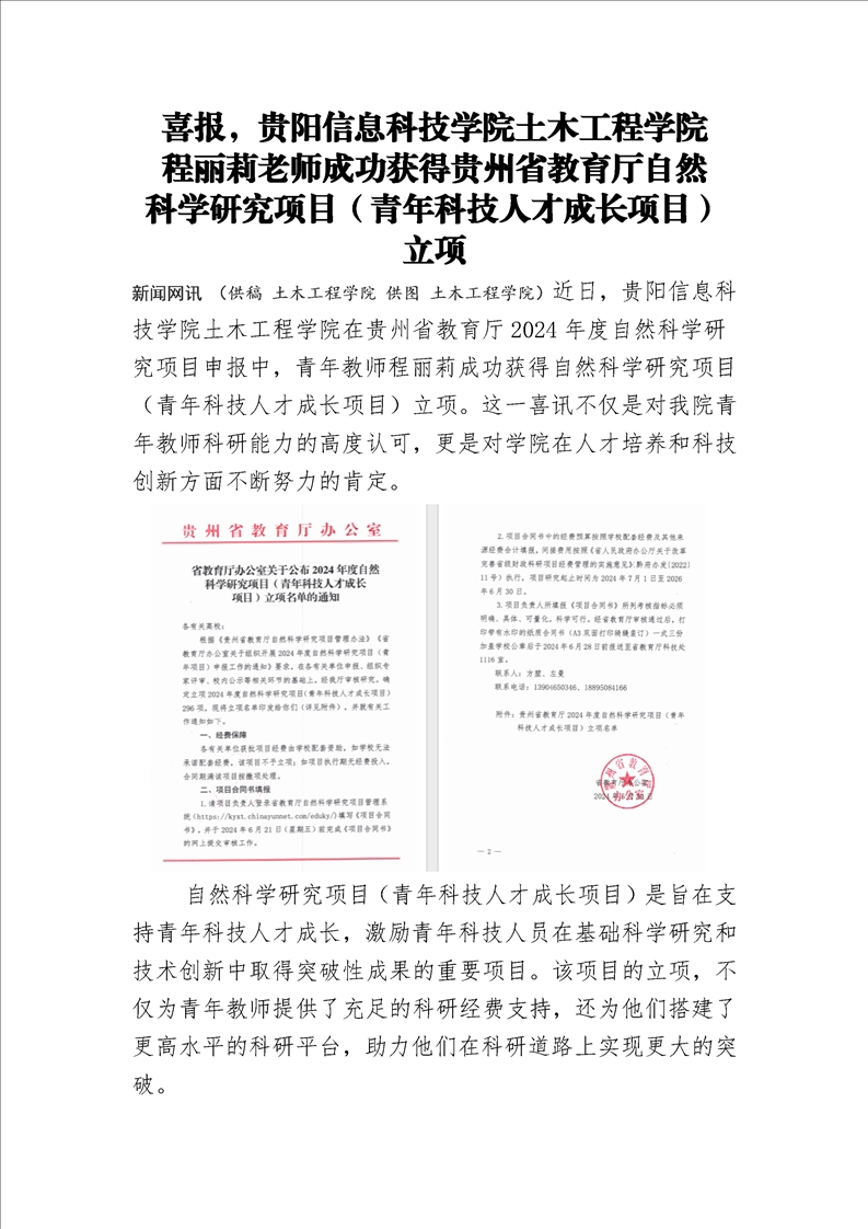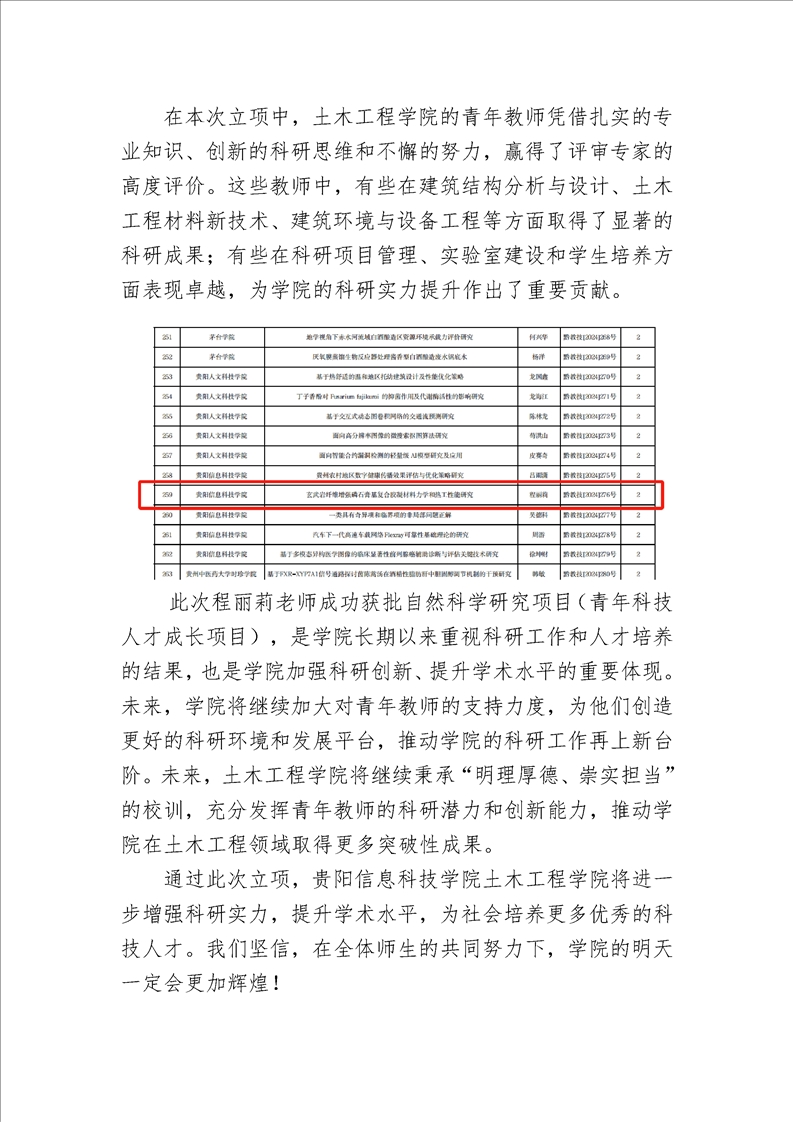 喜报,BV伟德中国官方网站土木工程学院程丽莉老师成功获得贵州省教育厅自然科学研究项目(青年科技人才成长项目)立项