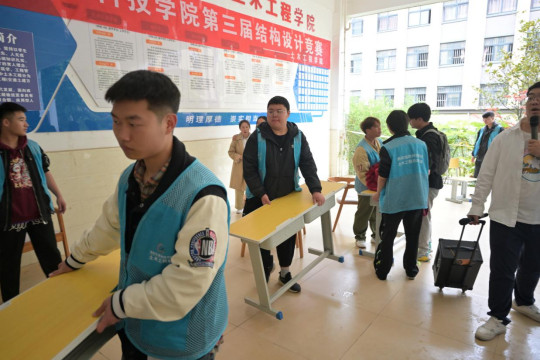 活动期间,志愿者们密切关注选手需求,及时补充短缺材料,认真维持现场秩序,后勤志愿者也为选手提供饮用水等物资保障。加载测试中,有的志愿者在入口引导选手有序入场,有的在比赛区域协助工作人员进行模型称重、加载等操作,还有的处理突发状况,以保障活动顺利推进。
