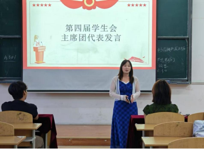 大会伊始,上一届团总支副书记杜宛妮率先登台发言。她深情回顾了过去一年学生会在思想引领、校园文化建设、服务同学等领域的卓越成就。从扎实开展“我为同学做实事”系列活动,到精心搭建高效便捷的学生权益反馈平台,再到积极助力校园精神文明建设,每一项成果都凝聚着全体学生会成员的智慧与汗水。