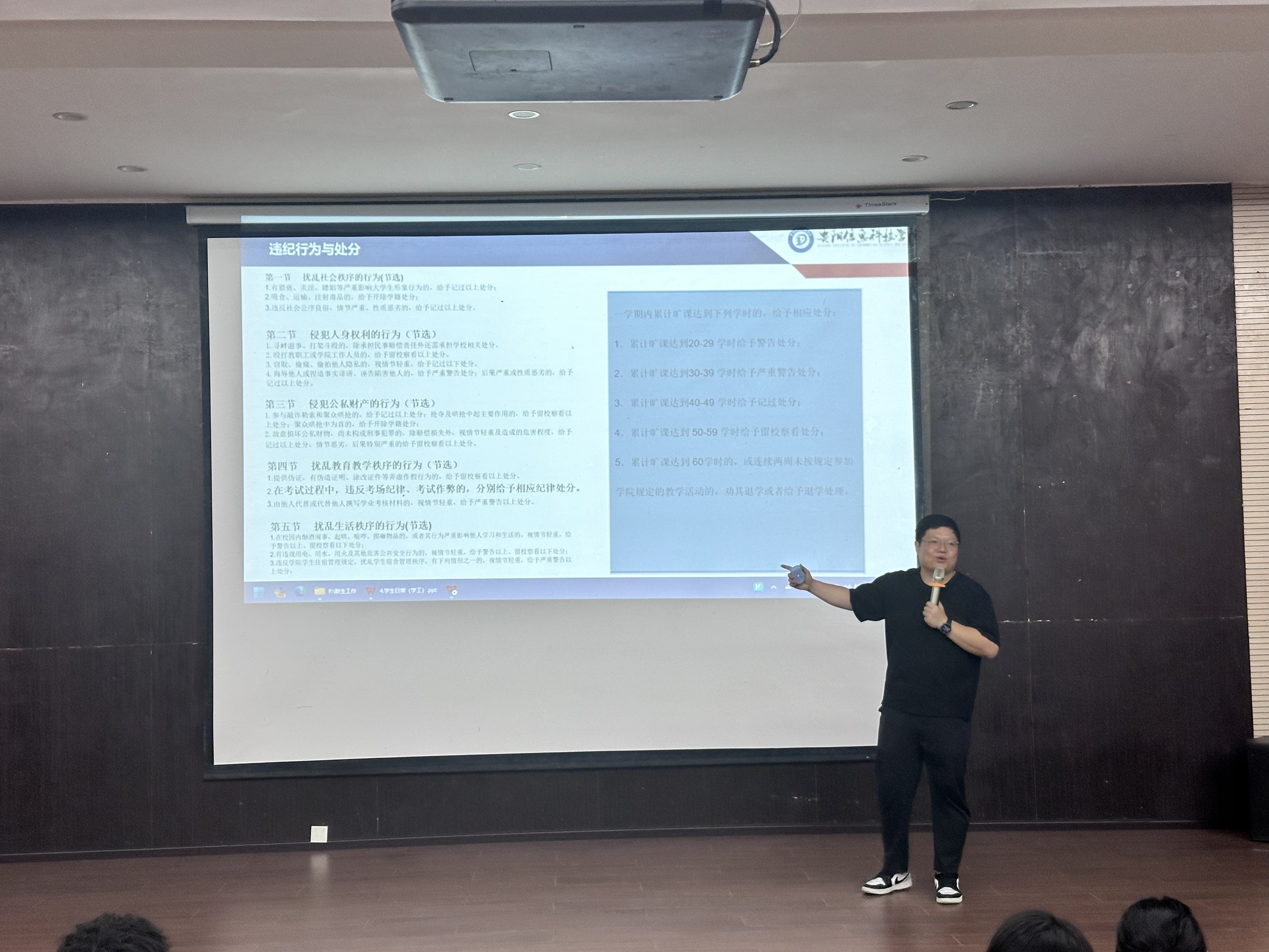 学业是大学的核心,规划是成长的前提。在随后的学业指导环节,学工办主任郭东越老师围绕《学生日常(学工)》《BV伟德中国官方网站全日制本科生学士学位授予实施办法》等内容展开专题讲解。他从学生日常管理规范、严格的学业考核要求,到清晰的学士学位授予条件,逐一为新生们厘清大学学业的“边界”与“路径”,让新生们明确了大学学习的目标与方向,为后续投入专业学习做好了充分的认知准备。