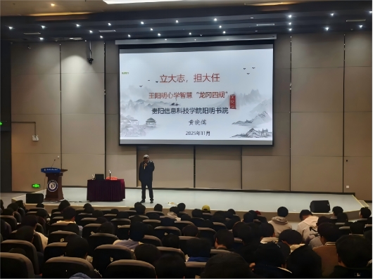 黄晓儒书记以《立大志、担大任:王阳明心学智慧“龙冈四规”》为题,围绕王阳明“立志为圣、知行合一”的人生轨迹,讲述王阳明在贵州龙场悟道提出“心即理”“致良知”思想的过程,揭示了阳明心学的深刻内涵。结合当代大学生成长实际,黄书记深入阐释了“立志、勤学、改过、责善”四大精神,即“龙冈四规”的核心。他以幽默而深刻的语言,勉励同学们珍惜大学时光,树立明确目标,养成自律、克制与独立思考的能力。他回顾了王阳明在贵州讲学、创办书院三十余所,推动贵州文化启蒙的历史,指出“知行合一”已成为贵州人文精神的重要标识,鼓励学生将学习、做人、做事融为一体。