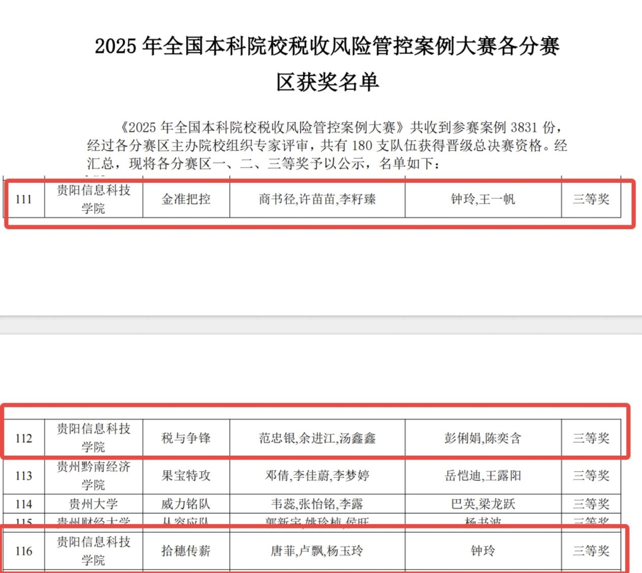 新闻网讯(供稿/供图 宋大群)2025年全国本科院校税收风险管控案例大赛分赛区评审结果近日公布。本次大赛吸引全国本科院校提交参赛案例3831份,经各分赛区专家严格评审,180支队伍晋级总决赛。伟德官网会计专业3支队伍在钟玲、王一帆、彭俐娟、陈奕含等老师指导下,参赛学生凭借扎实专业素养与实践能力,均获贵州赛区三等奖,彰显学校财税专业人才培养成效。