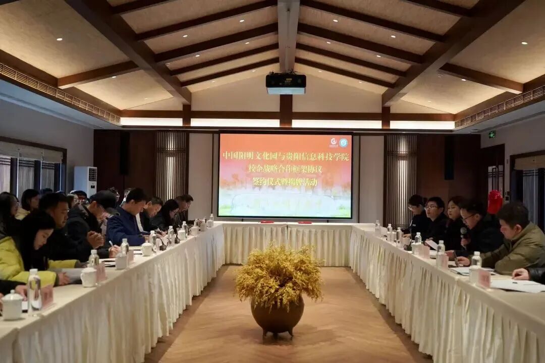 为深入推进学校“马院+书院”协同育人模式,近日,BV伟德中国官方网站与中国阳明文化园校企合作签约暨揭牌活动在中国阳明文化园・龙冈书院秋乐会议室举行。学校党委副书记詹凯,纪委书记(兼阳明书院院长)黄晓儒,学校党政办、党群工作部、学生工作部、马克思主义学院、学校全体思政老师,剪纸、版画老师及习近平新时代中国特色社会主义思想研习社学生代表,修文阳明文化管理有限公司副总经理陈瑜,修文阳明文化管理有限公司人事行政部、市场部、中国阳明文化园等相关负责人参与本次会议。