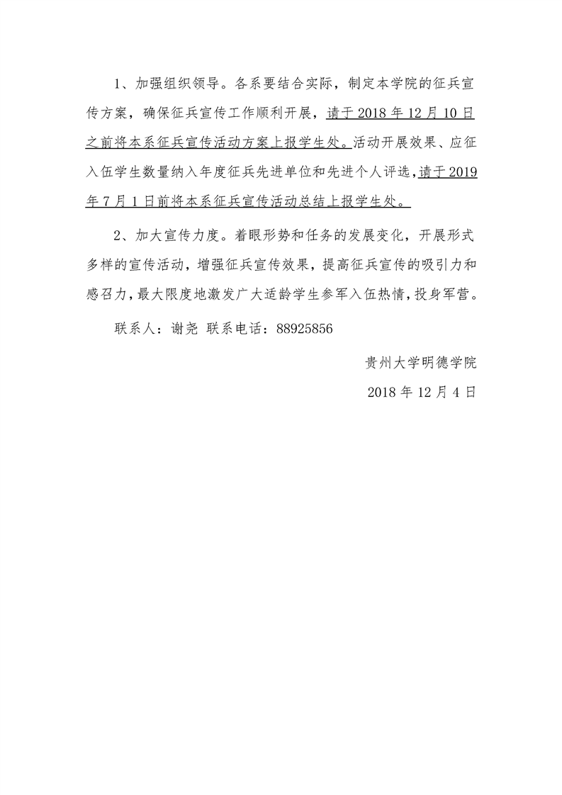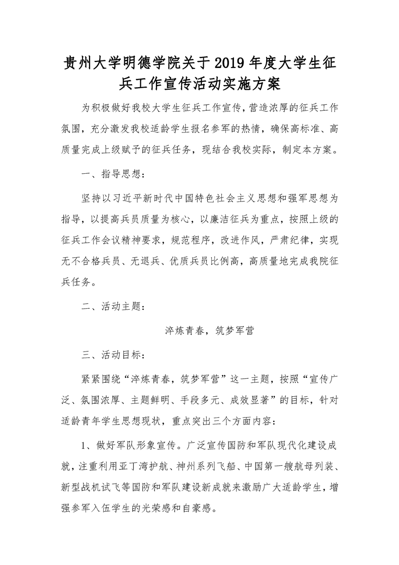 贵州大学明德学院关于2019年度大学生征兵工作宣传活动实施方案