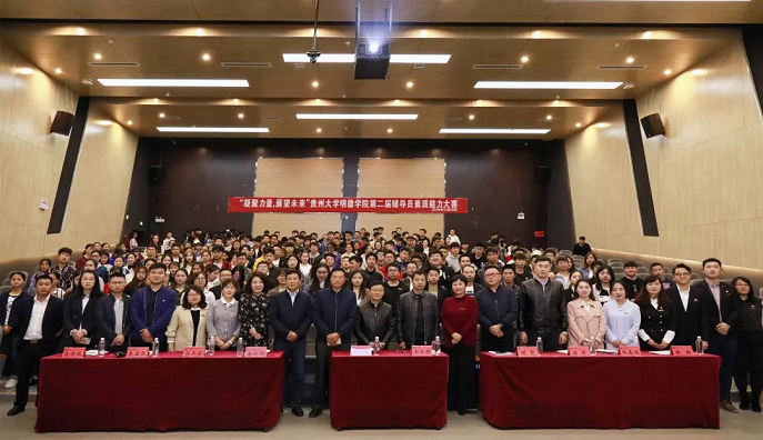 新闻网讯(学工部 邹佩君)为深入学习贯彻习近平新时代中国特色社会主义思想和党的十九大精神,全面贯彻落实全国高校思想政治工作会议和全国教育大会精神,加强学院辅导员队伍建设,3月28日18:30,由学生工作处主办的“凝聚力量,展望未来”辅导员素质能力提升工程——贵州大学明德学院第二届辅导员素质技能大赛决赛在图书馆报告厅举行。学院党委书记郭林桦、常务副院长罗卫东,副院长谢静,党委副书记金明辉,院长助理、学生工作处、招生就业处处长宿强,院长助理、财务处处长杨兵荣,院长助理、数字传媒系系主任康俊以及各系党总支书记作为评委出席比赛。学院全体辅导员和学生代表观摩了比赛。