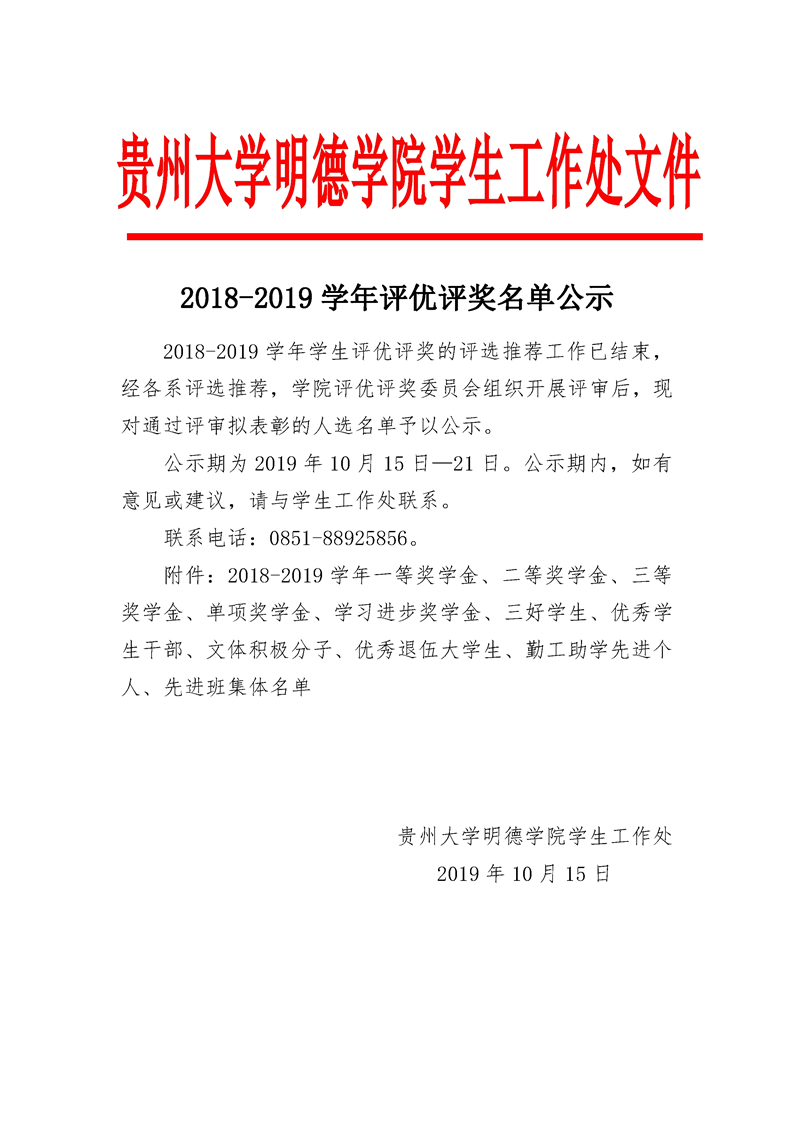 贵州大学明德学院2019年贵州省普通高等学校三好学生、优秀学生干部、先进班集体公示