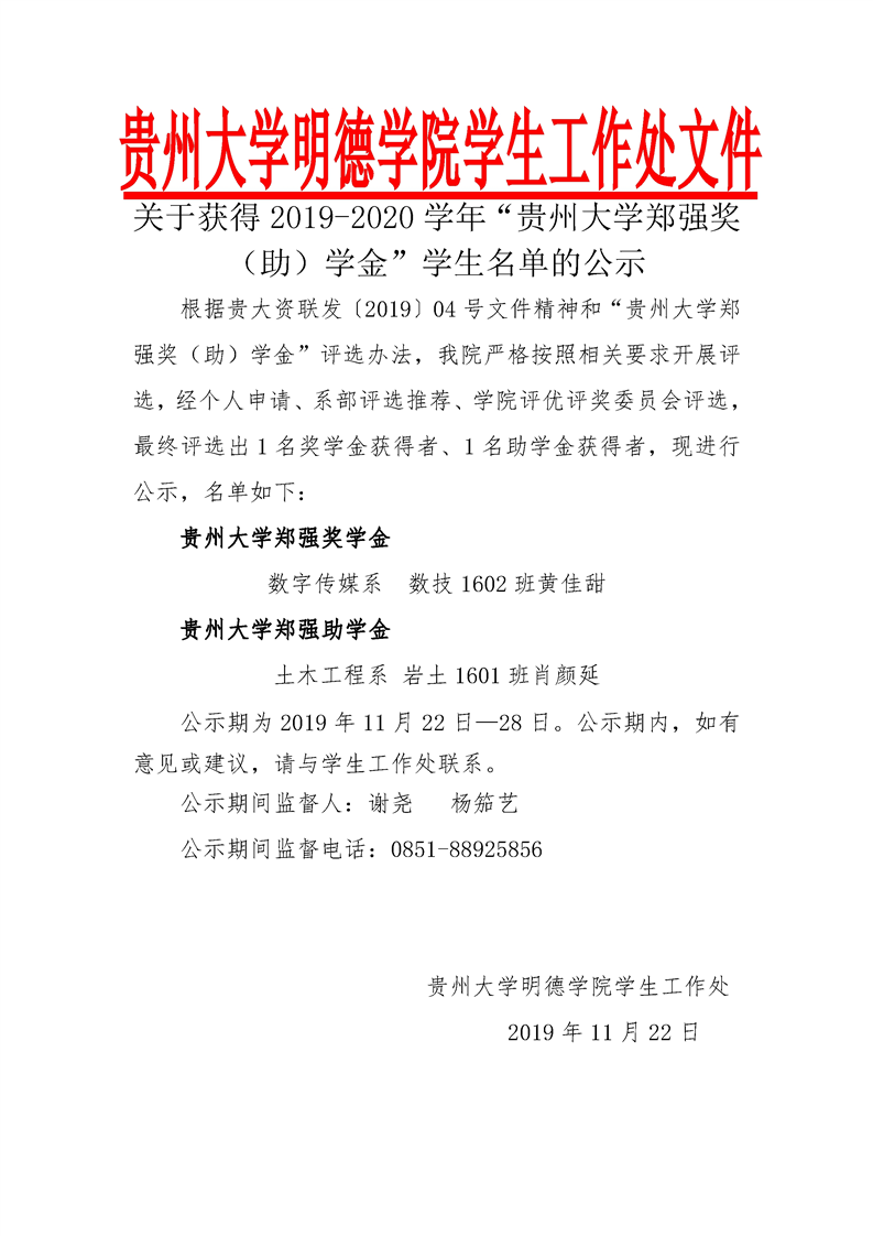 关于获得2019-2020学年“贵州大学郑强奖(助)学金”学生名单的公示