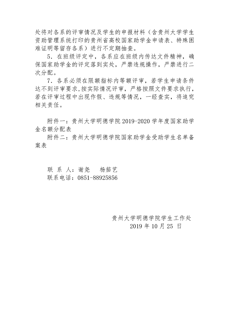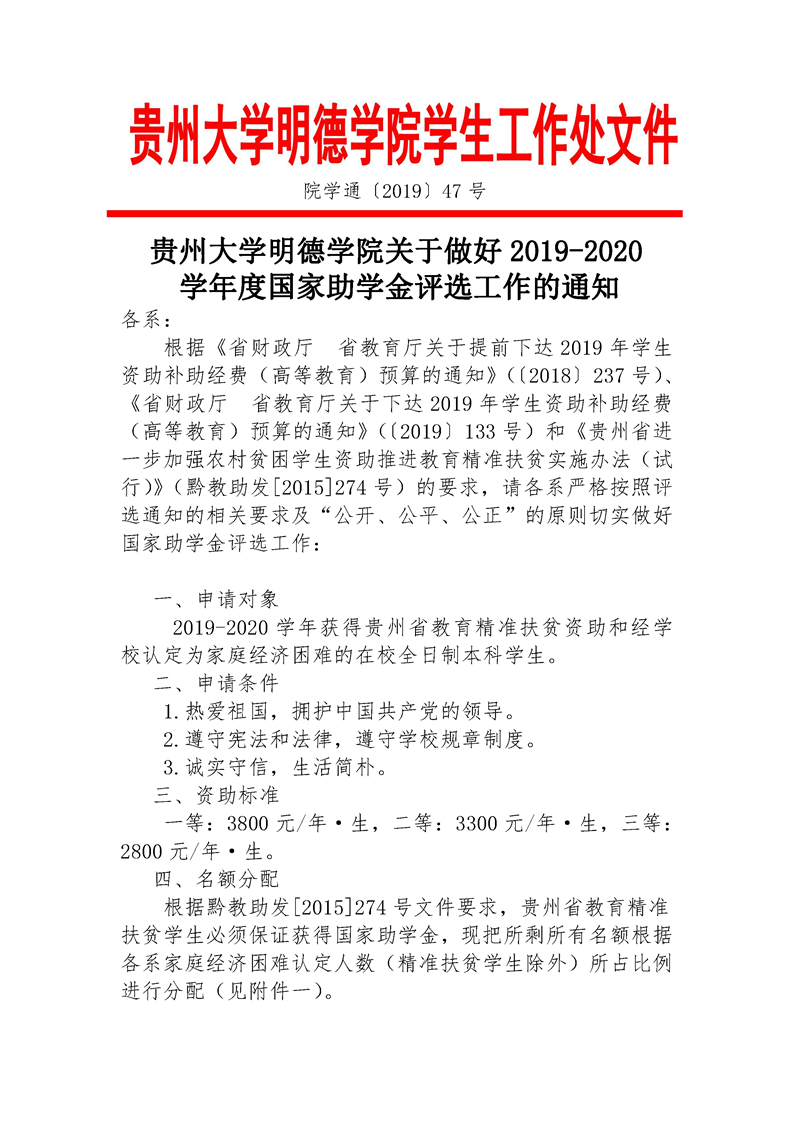贵州大学明德学院关于做好2019-2020学年度国家助学金评选工作的通知