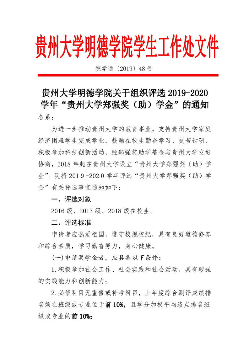 贵州大学明德学院关于组织评选2019-2020学年“贵州大学郑强奖(助)学金”的通知