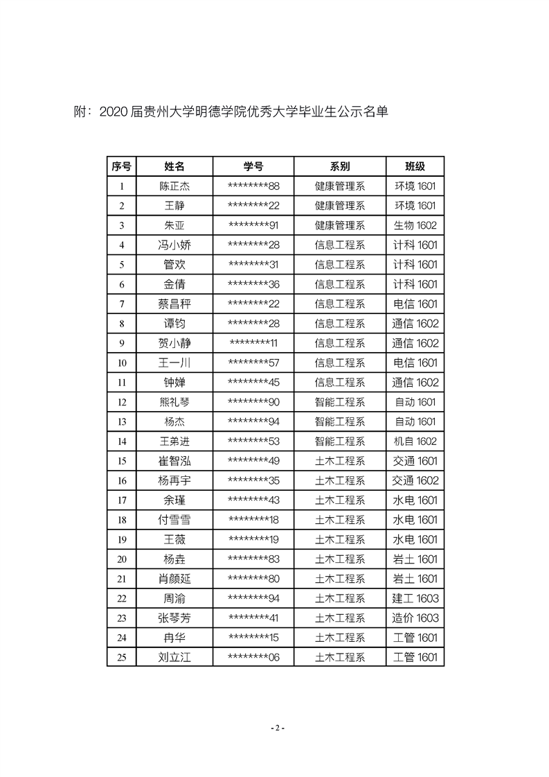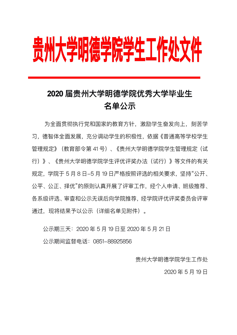 2020届贵州大学明德学院优秀大学毕业生名单公示