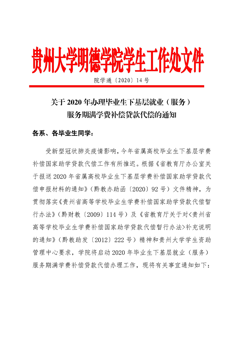 关于2020年办理毕业生下基层就业(服务)服务期满学费补偿贷款代偿的通知