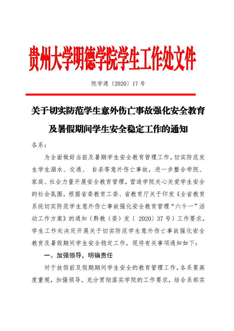 关于切实防范学生意外伤亡事故强化安全教育及暑假期间学生安全稳定工作的通知